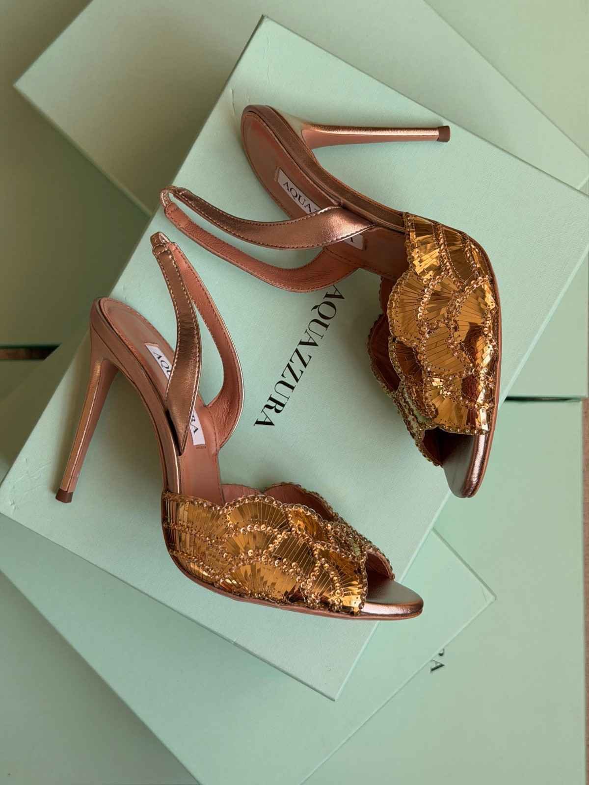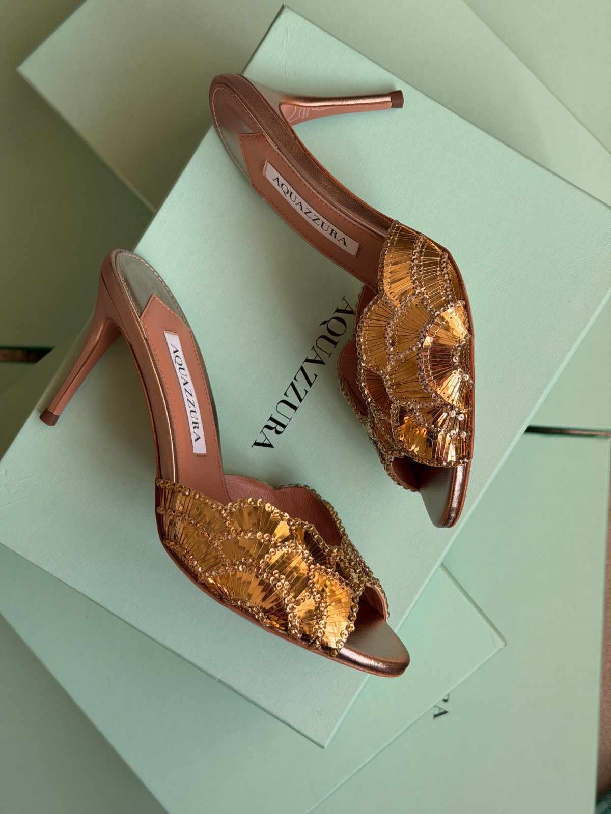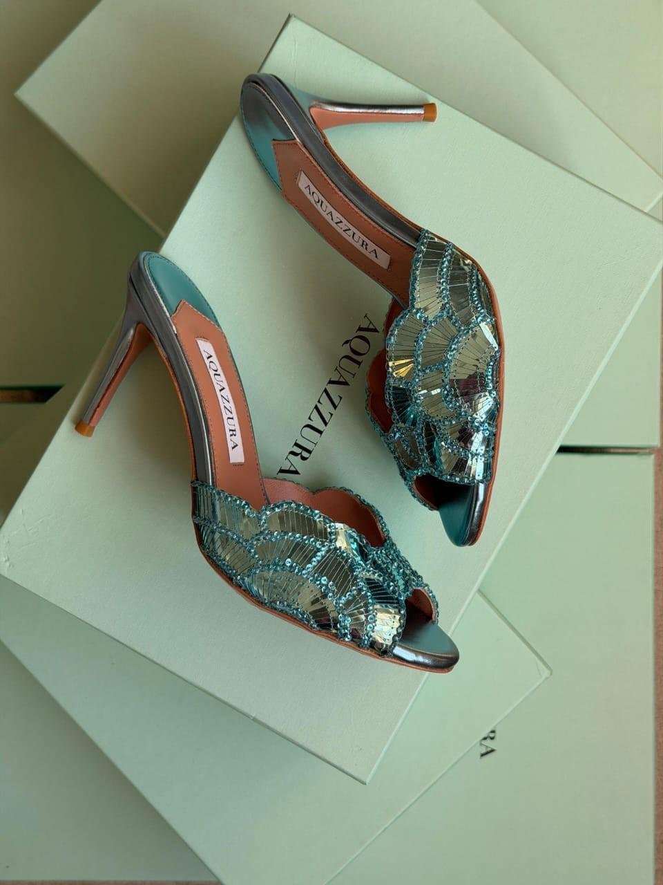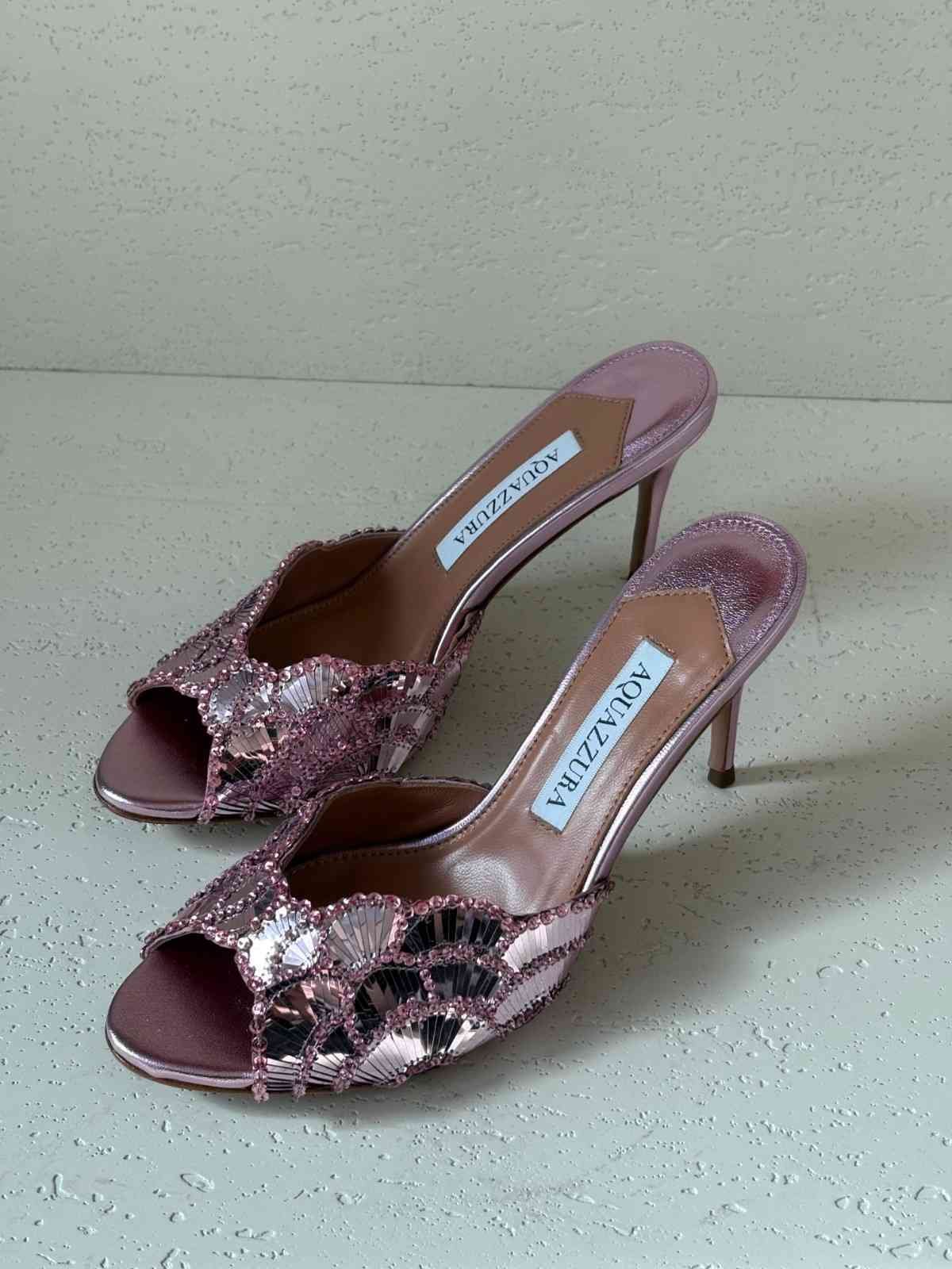 Aquazzura Ce Soir 75MM Embellished Satin Metallic Leather Mules