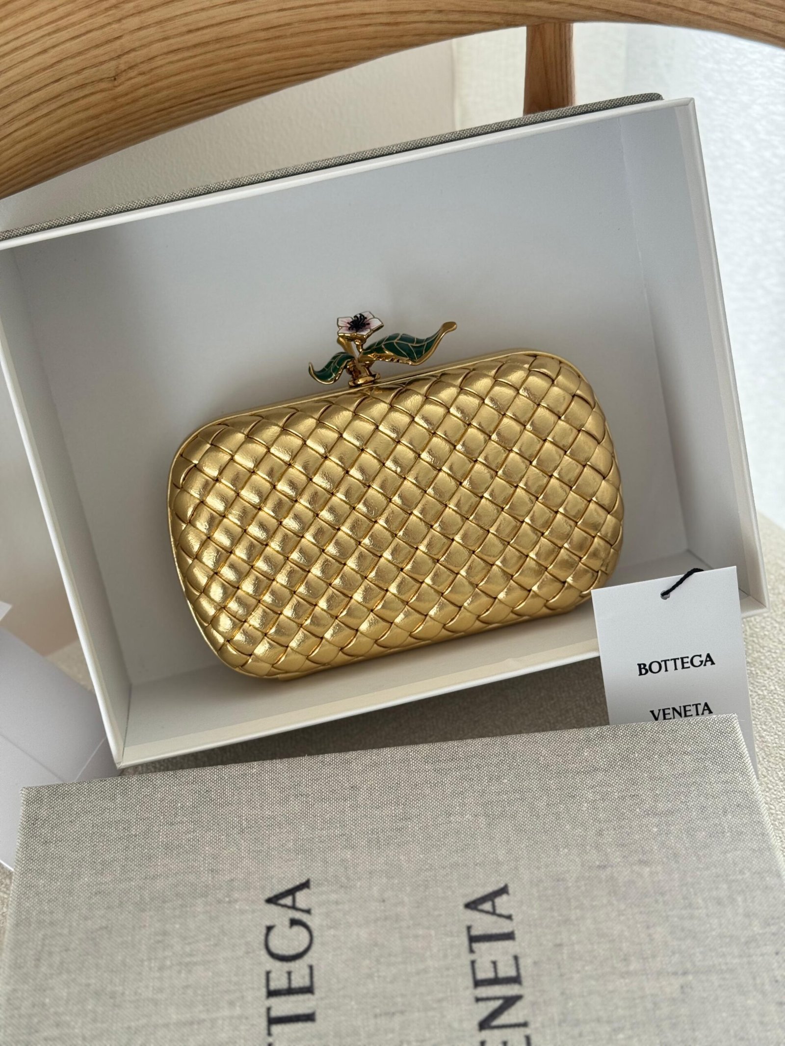 • Padded Intreccio wood-embossed lamina leather minaudiere