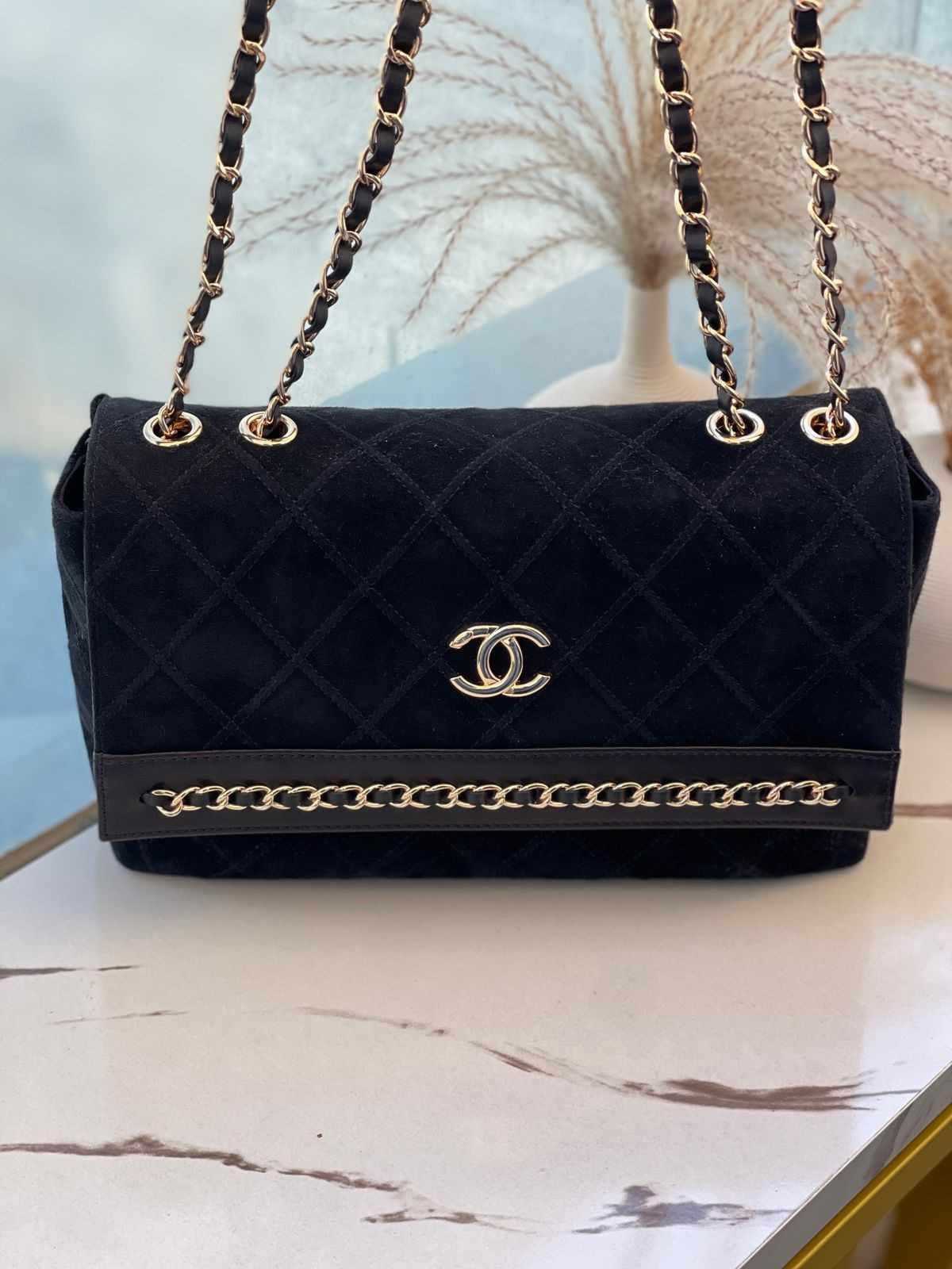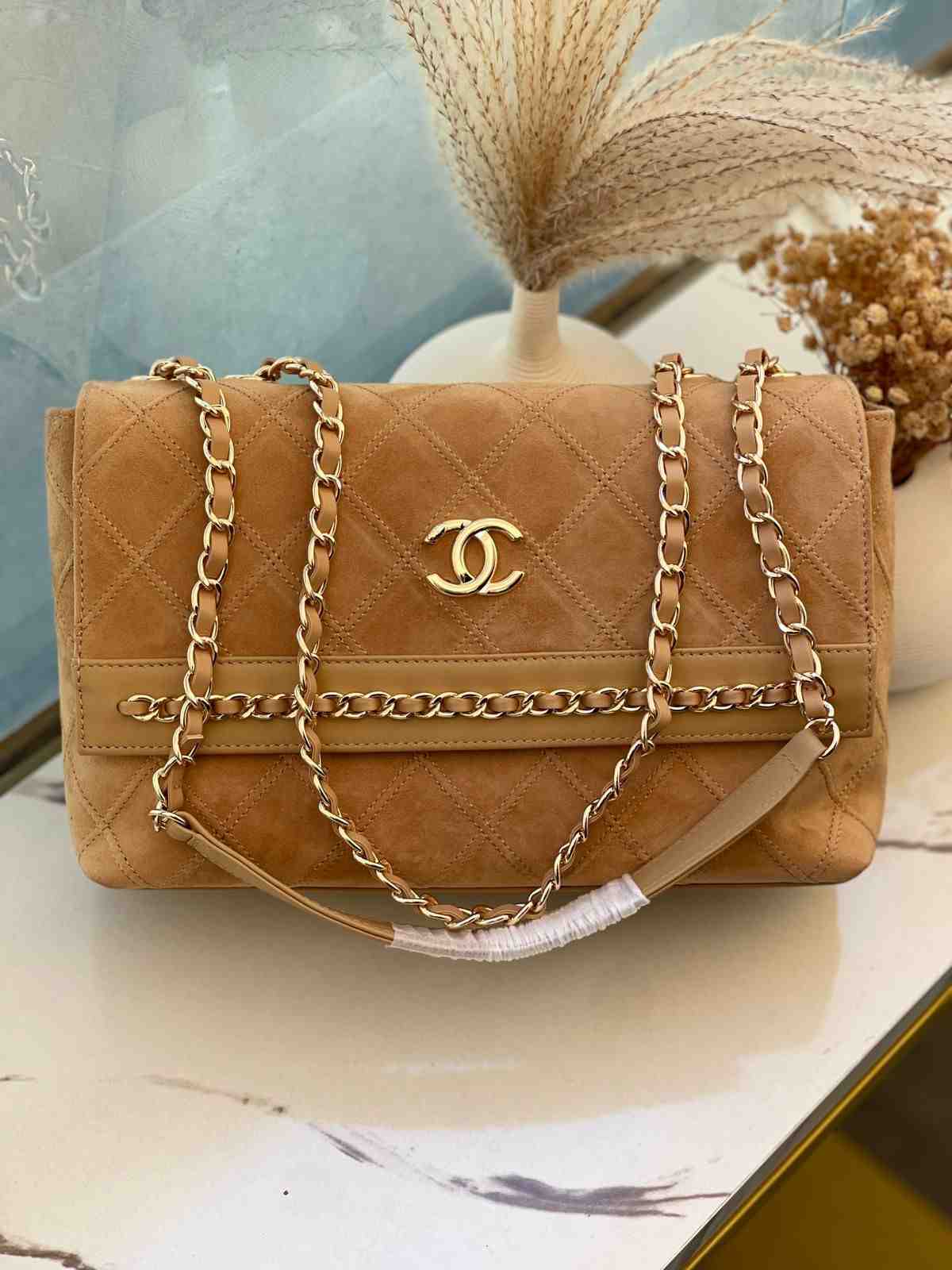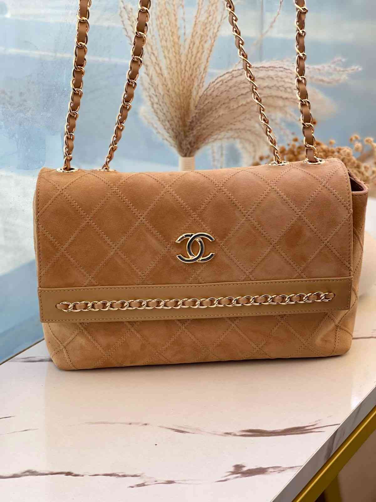 Chanel CC Suede Flap Bag with Gold Tone Metal Design