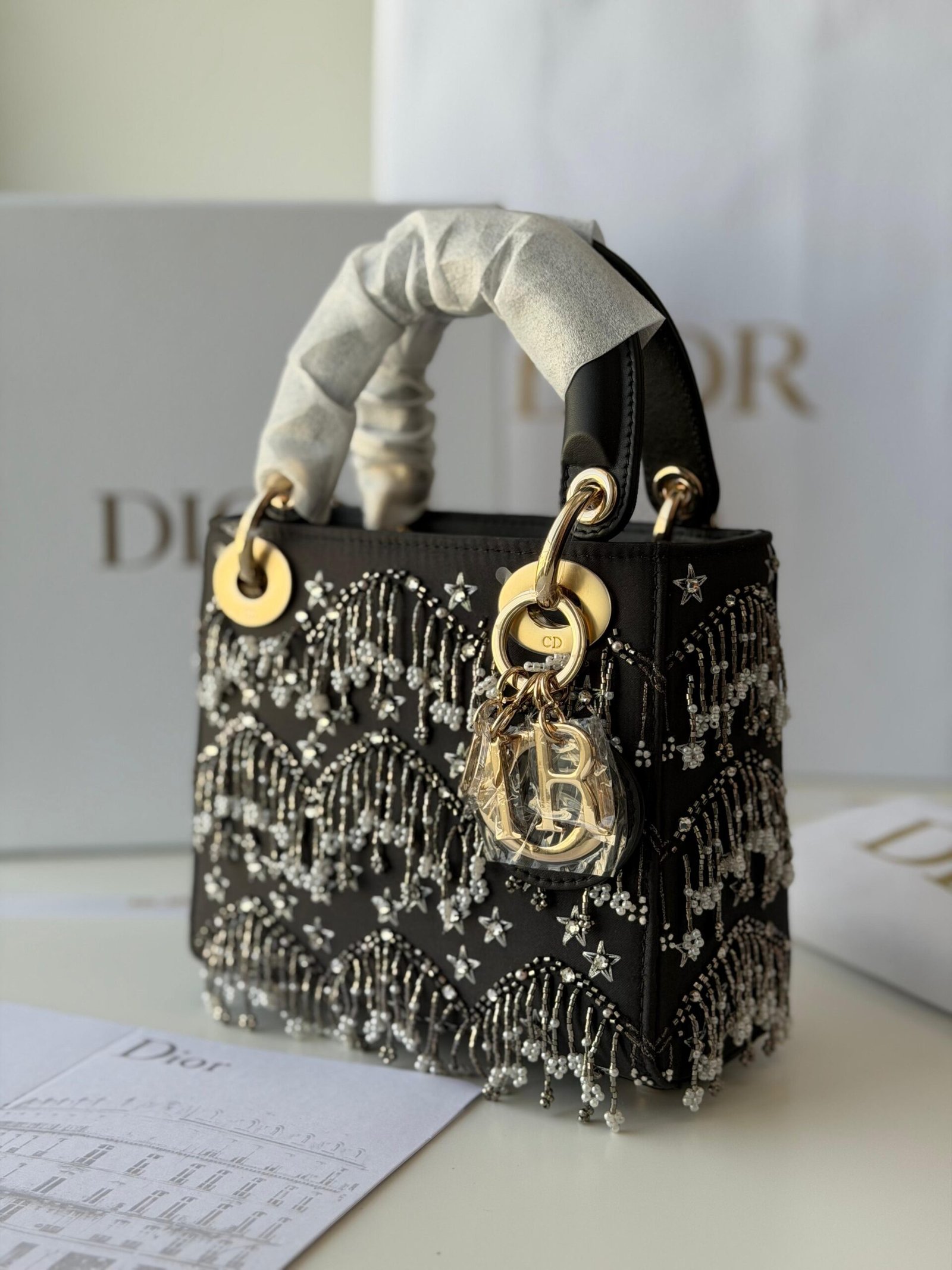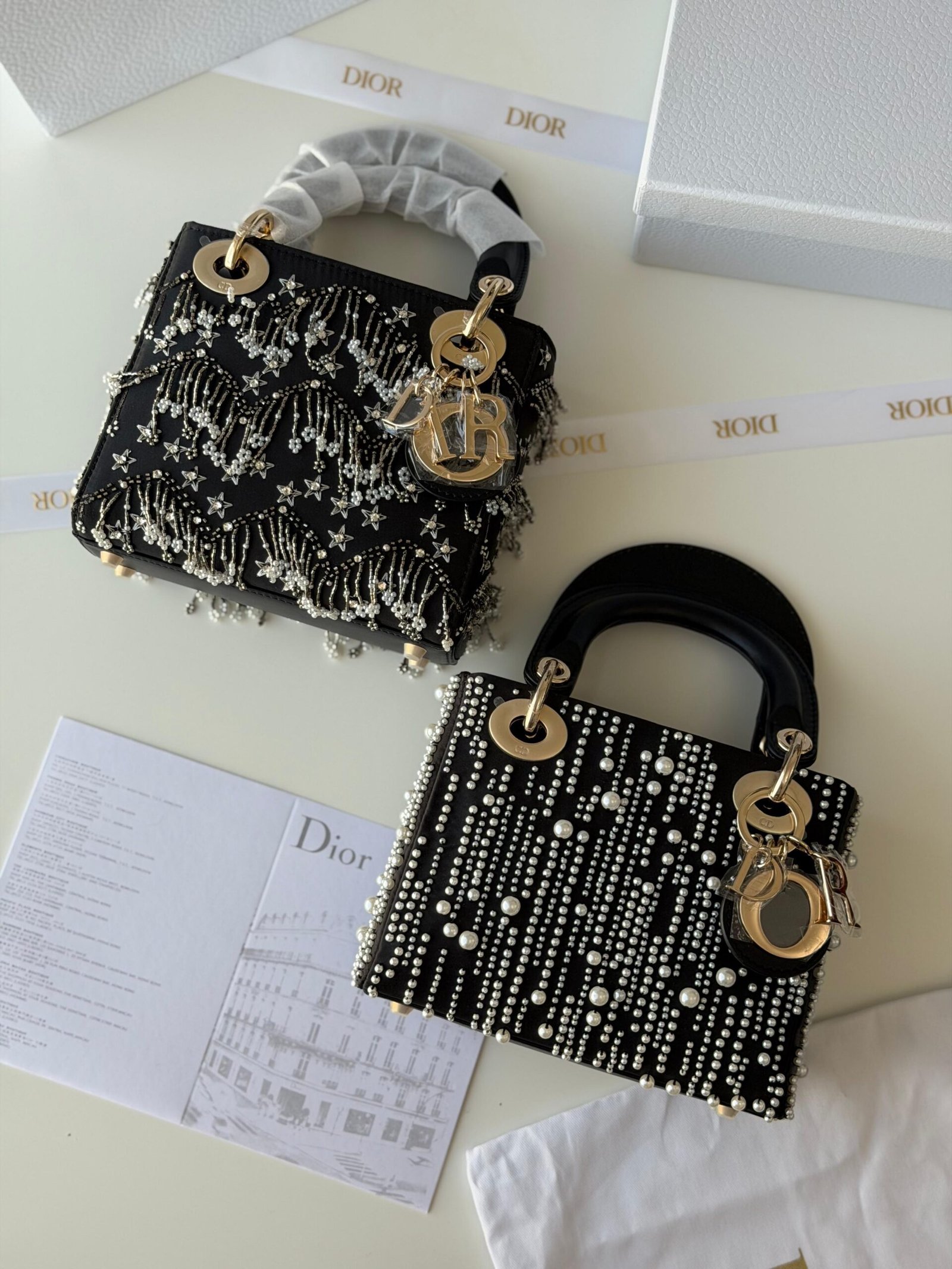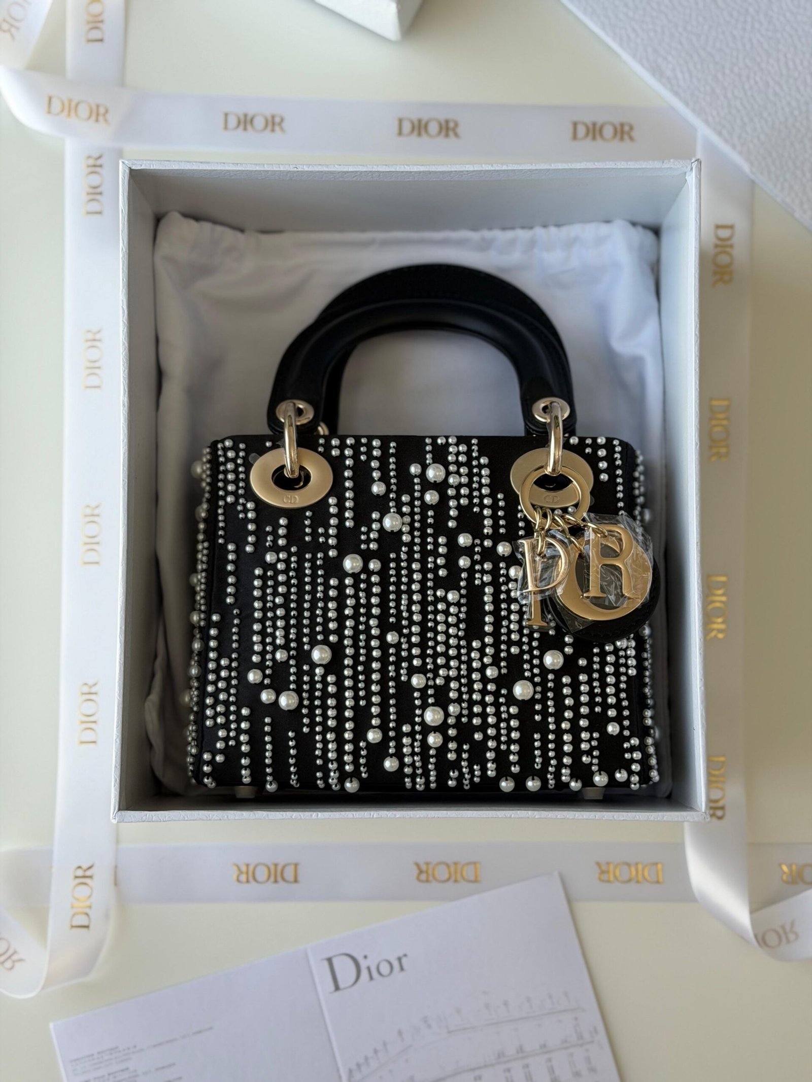 Dior Lady Dior Leather White Resin Pearls Mini Handbag Black